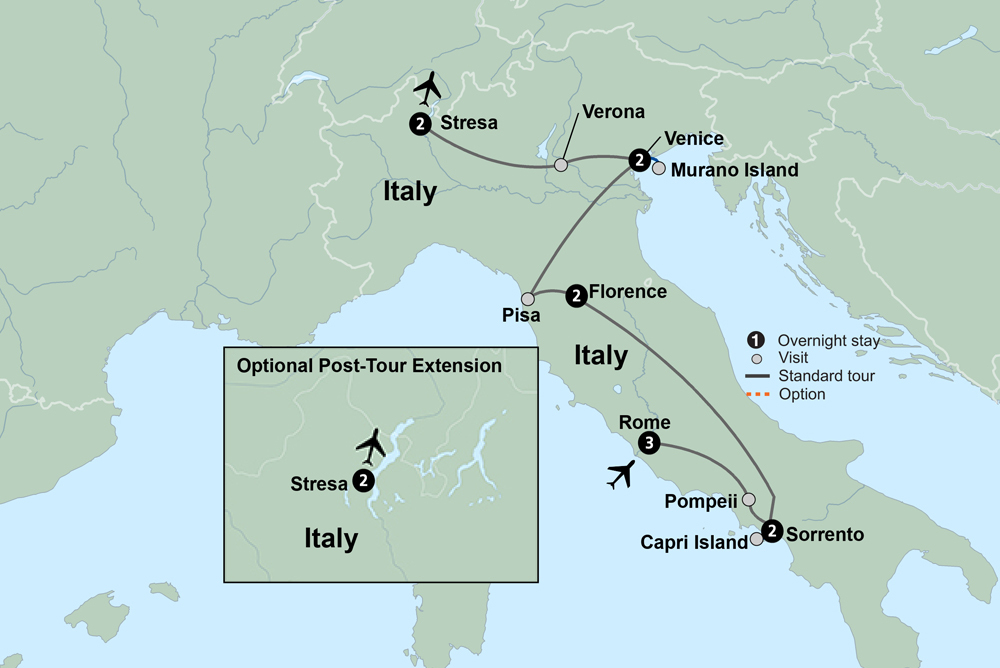 From the ancient ruins of Pompeii to the chic charm of the Sorrento Coast, embark on a spectacular Italian getaway. Enjoy multiple-night stays in Rome, the charming coastal town of Sorrento, Florence, Venice, and Stresa in the Lake District. Discover the treasures of Classical Rome, including the Colosseum. Walk in the footsteps of the ancient Romans in Pompeii. Take a boat to the enchanting Isle of Capri. See the gems of the Renaissance in Florence, a veritable open-air museum. Marvel at the Leaning Tower of Pisa and stroll the streets of Verona. Stop at a Tuscan winery and farm for a lunch of regional specialties and wines. Tour Venice and walk the Castello district. Cruise to Isola dei Pescatori, one of the scenic Borromean Islands. Delve deeper into its history and culture as you visit some of the world’s most beautiful locales.
