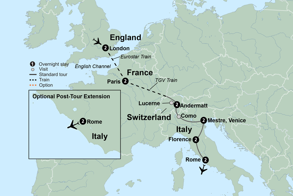 Set your sights on the European journey of a lifetime and discover all the must-sees of England, France, Switzerland and Italy. See the incredible sites of London, from Buckingham Palace to Big Ben. Take the Eurostar train to Paris and personalize your stay by touring the “City of Lights” on a relaxed panoramic drive or on a walking tour of the hilltop Montmartre district. Take in breathtaking views from your dinner table aboard a Parisian river boat. Board a high-speed train bound for Lucerne, the enchanting Swiss city on a cobalt lake and one of Switzerland’s most beautiful places. In Venice, discover a floating city where iconic landmarks of centuries-old history line canals dotted with gondolas. Tour Florence, the “Cradle of the Renaissance.” Finally, in Rome, bask in cultural treasures and envelop yourself in the history of the “Eternal City,” which includes a visit to the Sistine Chapel. Storied history, mouthwatering cuisine and iconic landscapes await.
